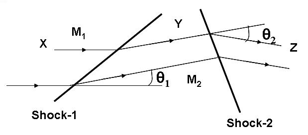 Consider a supersonic flow experiencing a left running shock wave followed by a right running shock wave shown in Fig. 21.5. Corresponding P-θ is shown in Fig. 21.6. Consider a streamline XYZ in this flowfield.