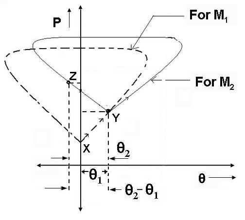 The initial or pre shock conditions are given point X on P-axis which corresponds to zero deflection. After passing through the first shock which is left running shock, the flow gets deflected by an angle θ1 which is represented by point Y. Here as well, we have to follow the P-θ diagram starting from point A, corresponding to its freestream conditions, to get the point Y. The point Y clearly portrays increase in pressure and positive deflection of the flow in the presence of left running shock wave. Further experience of right running shock wave brings in the change in flow properties which are represented by point Z. We have to draw a new P-θ diagram at point Y, corresponing to its freestram conditions, to arrive at point Z. For this fact, deflection of the flow at point Y would be treated as zero and relative displacement between point Y and Z (θ2) should be plotted to get the point Z. Since the flow is facing right running shock wave, the deflection θ2 is negative in reference with the origin at Y. However presence of the shock increases pressure of the flow. Therefore, state of the point Z given in this diagram gives total flow deflection and final pressure.