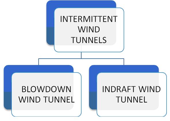 A high speed wind tunnels may be of open circuit type which draw air from outside atomsphere. Wind tunnels of closed circuit type re-circulate the inside air. Higher construction cost is one of the disadvantages of the closed circuit wind tunnel. These tunnels are generally used for continuous or long testi durations. However, power required to run a supersonic wind tunnel is enormous and is proportional to the cube of the velocity. For this reason high speed wind tunnels of continuous running type are not generally prefered. Hence most of them operate intermittently either using high pressure tanks or vacuum tanks. The wind tunnels which use high pressure reservoirs are called as intermittent supersonic blowdown wind tunnels. Another way of achieving the huge power output is with the use of a vacuum storage tank. These tunnels are called Indraft or Induction supersonic wind tunnels.Following tree (Fig. 37.2) shows the types of intermittent wind tunnels.