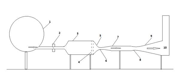 {1. High pressure air storage 2.Pressure regulator 3.Settling chamber 4.Screens 5.Nozzle 6.Sonic throat 7.Test-section 8.Second throat 9.Diffuser 10.Silencer}