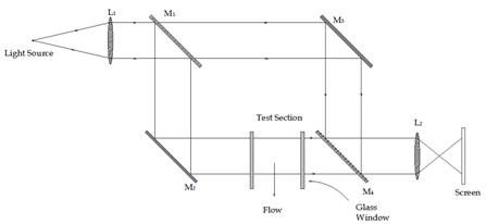 Figure 39.1 shows the essential features of the Mach-Zhender Interferometer. Light emitted from the source is allowed to pass through the lens L1 which makes the light rays parallel with each other. These parallel light beams are then passed through a monochromatic filter. The path of the light wave is then made by two ways as M1-M2-M4 and M1-M3-M4 in the way to fall on the screen as shown in Fig. 39.1. Here M represents mirror shown in same figure. These two paths are possible due to half silvered mirror M1 which divids a light beam into two beams. These two beams travel same distance in their respective paths before recombining at lens L2 and getting projected on the screen. Although the length of travel for both the beams is same, however the medium of travel is necessarily differerent since one beam which travels via M1-M3-M4 path actually enounters room air where as the other beam travelling through M1-M2-M4 passes through the test section. For the situation without any flow through the test section, both the rays face similar medium and fall on the screen as a single ray after combining. Thus a screen gets illuminated by a uniform patch of light. However, the situation changes with in the presence of flow in the test section where density change is encountered by one ray in the presence of shock. This increased density retards the beam passing through the test section and hence creates phase difference between the two beams. If this phase difference is λ/2 where λ is wave length, then two rays mark contrast spots on the screen. Therefore, we can observe dark and white bands on the screen for appreciable difference in the density.