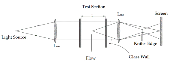 This techniques also uses a light source and lens where Light emitted from the source is collimated by the lens before passing through the test section. These light beams are then passed through one more lens before getting on the screen. A knife edge is placed at the focal point of the second lens where the images of the source is formed. Kinfe endge can be any opaque object which can be placed at the same location. This object or knife object is obstrcut the light beam. If the beams of light escape the knife edge the screen gets uniformly illumination. This situation is seen for no flow case through the test section since both the beams pass though the medium of same density. However during the flow taking place in the test section with test model mounted in it, both the light beams encounter different densities therefore make different deflections one of the beams pass through uniform or freestream density region while other beam passes through the portion of shock placed ahead the test model. in this way one beam passes through a region of uniform density while other passes through differential density regions or sees the density gradient. It is similar to the light beam passing through a prism when that ray of light bends. This is the reason for orientation of the knife edge for the known density gradient since the ray of light which encounters the density gradient creates differential illumination on the screen presence of knife edge. In this way Schlieren technique makes it possible to visualise density gradient by differential illuminations on the screen. A photographic plate or camera are generally used for viewing instead of screen.