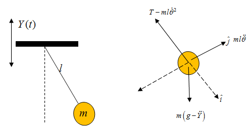 Figure 2.1.5: (a) Simple pendulum attached to a periodically translating support, (b) free body diagram of the mass.