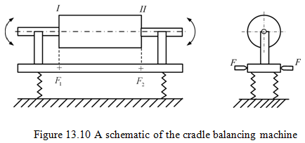 Hit-and-trial balancing method: The cradle is placed on four springs and can be fulcrum about F1 or F2 to form a simple vibrating system to oscillate about F2 or F1 , respectively. Two fulcrum can be located at two chosen balance planes (i.e. I and II), where the correction mass to be added. The rotor can be driven by a motor through a belt pulley arrangement. If the spring system is such that the natural frequency of the system is in the range of motor speed, the phase angle or the location of the mass in either plane can be determined as follows. The cradle can be hinged in plane I by fixing F1 and releasing F2. Run the rotor to resonance, observing the maximum amplitude to the right of fulcrum F2. This vibration is due to all the unbalance in plane II, since the unbalance in plane I has no moment about F1. Use a trial mass at a chosen location and determine the amplitude of vibration.
