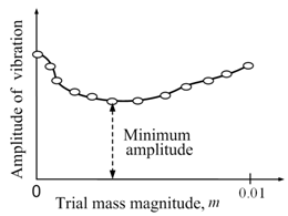 Make a plot of this amplitude for different location of the same trial mass (see Fig. 13.11a). The trial mass for correction is added at the location where the amplitude of vibration is minimum. Increase or decrease the trial mass at the same locations, until the desired level of balance is achived (see Fig. 13.11b). This will give correction mass for plane II. Similar procedure can be repeated by Fixing F2 and releasing F1 to get correction massk at plane I. This procedure is tedious and sometimes may be time consuming.