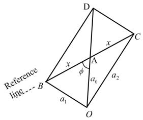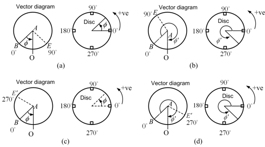 In Fig. 13.13(a) the left hand side figure represents the location of the intersection of fourth measurement on the circle (i.e., at E) for trial mass kept at 900 on the disc. This gives the CCW direction as positive for measurement of unbalance angular position, Φ, from 0o location (i.e., AB). The right hand side drawing of Fig. 13.13(a) represents the residual unbalance position, Φ, on the disc location that is CCW direction always (assumed) as positive from 00. In case for the above measurement the intersection of the fourth measurement (i.e., point E) is as shown in Fig. 13.13(b) for the trial mass kept at 900 on the disc then this gives the CW direction as positive for measurement of unbalance angular position, Φ, from 00 location (i.e., AB). The right hand side drawing of Fig. 13.13(b) represents the unbalance position, Φ, on the disc location that is CW direction as positive from 00. Similarly, Figs. 13.13 (c and d) can be interpreted, which are corresponding to measurement taken by placing the trial mass at 270° location on the disc.