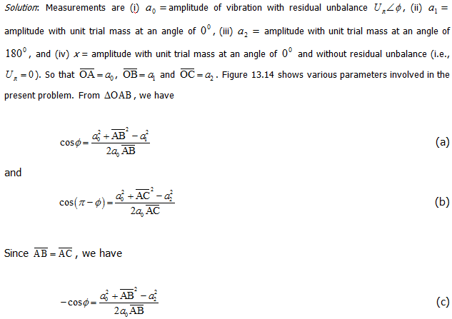 Example 13.3 In the balancing process we make the following observations: (i) ao= amplitude of vibration of the unbalanced rotor “as is” (ii) a1 = amplitude with an additional one-unit correction at the location 0 deg and (iii) a2 = same as a1 but now at 180 deg.