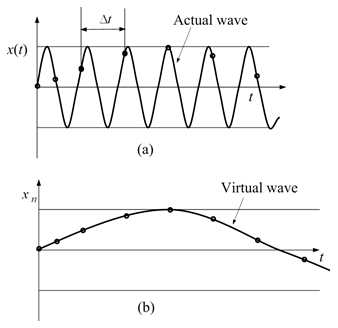 Now we shall highlight some other errors which may be involved in measuring the vibration signal. When an analog signal x(t) is changed into a sequence of digital data {xn} (n = 0, 1, 2, …, N) a virtual (or imaginary) wave is obtained if a fast signal is sampled slowly. For example, when a signal illustrated by the full line is sampled as shown in Figure 14.10(a) with black dots, a virtual signal wave as shown in Fig. 14.10(b) appears, although it is not contained in the original signal.