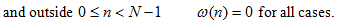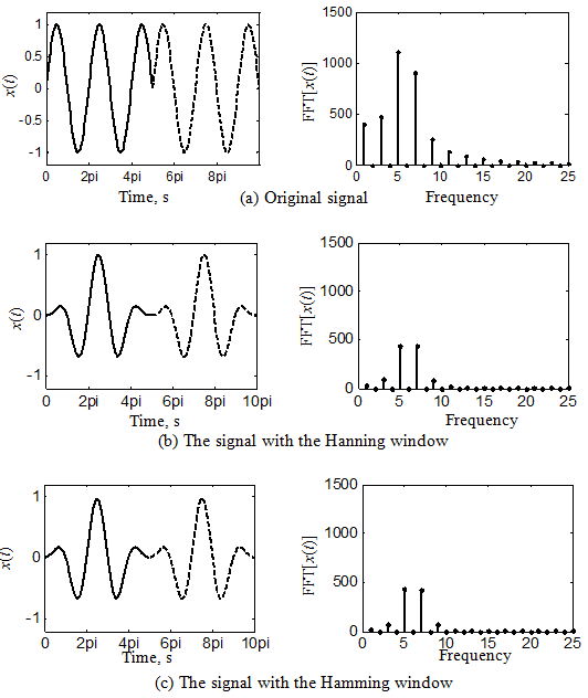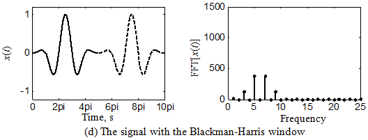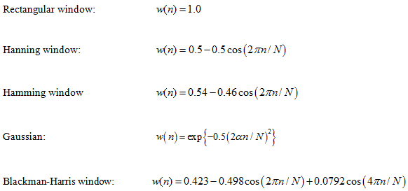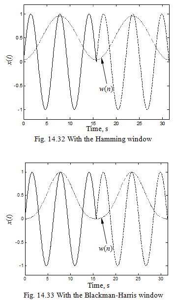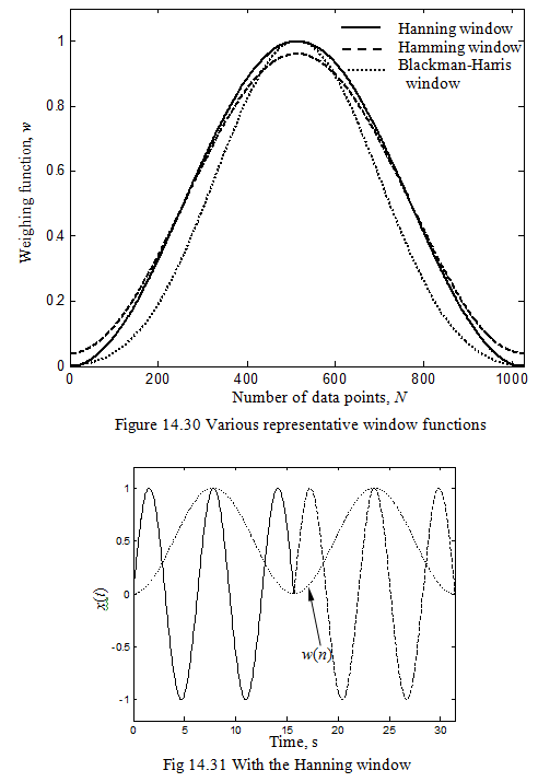 To decrease the leakage error due to discrepancy between the time duration measured and the period of the original signal, we must connect the repeated wave smoothly. For this purpose we multiply a weighting function that decrease gradually at both sides. This weighting function is called time window. Representative time windows are: the Hanning window, Hamming window, and Blackman-Harris window are shown in Figure 14.30. These windows along with some more are defined in the range: 0 ≤ n ≤ N -1 as