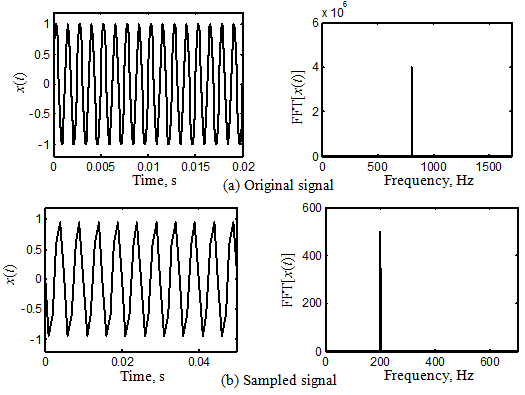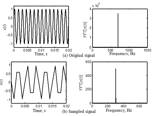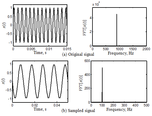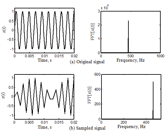 This phenomenon in which an entirely new signal is obtained during sampling the actual analog (i.e., the continuous) signal, is called the aliasing. This phenomenon could be seen in old movies where the wheel of a horse-cart appears rotating in the opposite direction even when the cart moves forward. This is due to the fact that the rate of picture frame recorded by the camera is much slower than the rotational frequency of the wheel. Another example could be that when we look at an accelerating fan it appears to us in between for some time as if it is rotating in the backward direction (or in the forward direction with very slow speed). It is again due to the fact that the human sight can capture pictures at a certain rate and when the fan speed is just slightly higher than the rate of picture frame captured by the sight, then the fan appears as if it is rotating in opposite direction (or at different speed then it is actually rotating). Similar behaviour is also observed during lightening of cloud while observing the fan in dark. This phenomenon is more obvious when we put stroboscope light on a rotating shaft. In stroboscope the light flashes (switches on and off) at a particular rate, which can be adjustable. When the flashing rate is same as the shaft speed (or integer multiples) the shaft appears as if it is stationary. It due to the fact that whenever light flashes the shaft occupies the same orientation and if we see a mark (or keyway) on the shaft, it will appear stationary. A slight decrease in the flashing rate makes the shaft to appear as rotating slowly in the same direction as the actual direction (when flashing rate is slightly lower than the shaft speed the mark on the shaft will shift in forward direction in the subsequent flashes and hence the shaft will appear as it is rotating in forward direction with slower speed i.e. with a speed equal to the difference between the actual shaft speed and flashing rate), however, a slight increase in the flashing rate makes the shaft to appear as if rotating slowing in backward direction as compared to the actual direction of rotation.