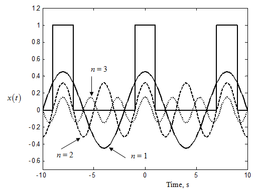 Fig. 14.22 Comparison between the continuous square wave in time domain and the corresponding complex Fourier series up to different harmonics (n is the number of harmonics included)