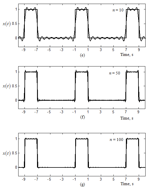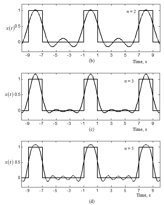 Fig. 14.21 shows a square wave and its various harmonic sine waves, by adding more and more these harmonic waves the square wave could be obtained. Figures 14.22(a)-(g) show how by gradually adding more terms in the Fourier series, it approaches the actual signal. In these figures n represents the number of terms in the Fourier series.