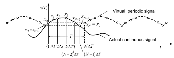 Now the procedure of computing the DFT is explained now as follows. Let us assume that we obtained discrete time series x0,x1,x2,x3,....,xN-1 by the sampling. These data are extended periodically to make a virtual periodic signal, as shown by the dashed curve in Figure 14.24.