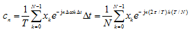The fundamental period is T = NΔt and the fundamental frequency is ω0 = Δω = 2π/T. If this dashed curve is given as a continuous time function, its Fourier series expansion is given by the expressions obtained by replacing ω with Δω in equations (14.3) and (14.5). However, in the case of a discrete signal, the integral of equation (14.5) must be calculated by replacing t, T, x(t) and ∫ with kΔt, NΔt, xk and ∑, respectively. By such replacements, we have