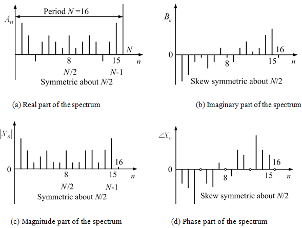 These spectra have the following characteristics: (a) The spectra is periodic with period N (this is also observed in equation (14.20)). (b) The same spectra as those of the negative order n = -N/2, …, -1 also appear in the range n = N/2, …, (N-1). (c) The spectra of the real part and those of the amplitude are both symmetric about n = N/2. (d) The spectra of the imaginary part and those of the phase are skew-symmetric about n = N/2, and (e) The spectra in the left half of the zone n = 0, …, (N-1) are valid. The spectra in the right half are virtual and are too high compared to the sampling frequency (this is also observed while discussing the aliasing effect in equation (14.23)).