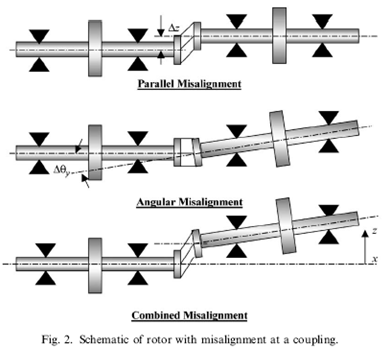 Unbalance and misalignment are the two most common source of machinery vibration. The objective of the alignment is to have two coupled shafts perfectly collinear under operating conditions or between the bearing and the shaft their axis should be co-linear or two bearings carrying a common shaft should have their axis collinear. Accordingly, misalignments can be classified as (i) parallel (ii) angular, and (iii) combination of parallel and angular misalignments (Fig. 15.4). Like the unbalance, the misalignment is an installation and subsequent maintenance problems, since it can be corrected and prevented by using the proper installation and maintenance procedures. Shafts with a heavy pre-load carried by the bearings (e.g., in angular contact ball bearings in tandem, the preloading must be applied to keep the bearing in assembled position), as distinct from the out-of-balance load, can show variation characteristics similar to those caused by bearing misalignment (Figure 15.6). This category of fault is probably the second most common cause of machine vibration, after the unbalance. A pre-load might also be applied at a bearing as a consequence of gear-mesh forces, aerodynamic forces and hydrodynamic forces. Misalignment may be present because of improper machine assembly or as a consequence of thermal distortion, and it results in additional loads being applied to the bearing.