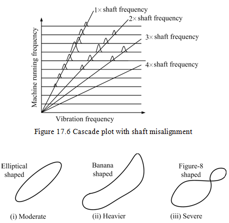 The misalignment of adjoining shafts, or of the bearings of one shafts, causes abnormal loads to be transmitted through the bearings, and imposes additional bending stress on the shaft thereby reducing its fatigue life. In some cases misalignment may cause one bearing to be unloaded (if the pre-load so applied is in the opposite direction to the normal gravity loads, this can result in lowering the machine critical speed or even instability in the system. These symptoms are sometimes present in addition to that of excessive vibration. The vibration associated with misalignment occurs at 1x machine running speed but, unlike unbalance case, there is usually a substantial component in the axial direction, which may be greater than radial direction. Substantial amounts of misalignment (or the pre-load) can also cause vibrations at frequencies of 2xmachine running speed, and sometimes higher multiplies. When the amplitude at twice the machine running speed exceeds 150 percent of the amplitude at running frequency, the misalignment is producing a severe action at coupling.