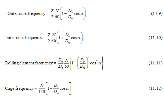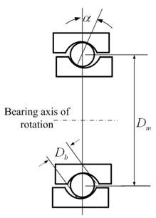 where N is the shaft frequency in rev/min, Db is the ball diameter,Dm is the pitch diameter of the bearing, α is the contact angle, and Z is the number of rolling elements.