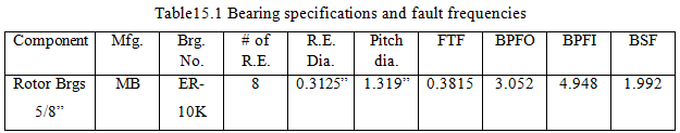 After that the defective bearing was then installed in the outboard position. Data were collected at similar speeds as previously. Baseline measurements were compared with the vibration signatures of the defective bearings. Tables 15.2-15.4 illustrate the trends of fault frequencies and adjacent harmonic frequencies at different rotational speeds.