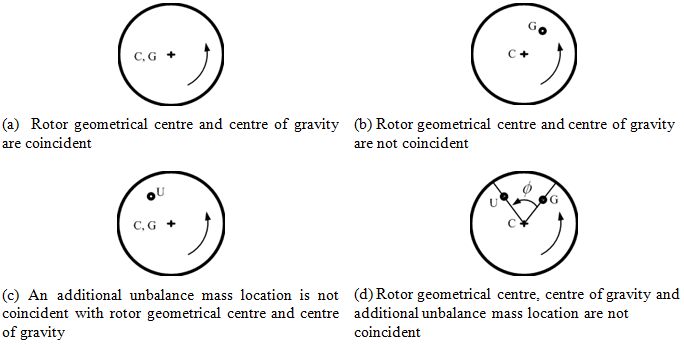 where m is the mass of the rotor, ω is the spin speed of the rotor, e is the eccentricity of the rotor (i.e., e = CG, see see Figure 2.2(b)) and the product me is normally called the unbalance. The above unbalance force will come when the rotor is eccentric, i.e., the rotor center of rotation and the center of gravity are not coincident. This type of unbalance is called the residual or inherent unbalance.