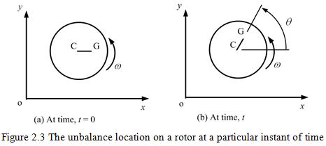 Figure 2.3 shows positive conventions and variables to define the unbalance location on a rotor system at a particular instant of time, t. For a constant angular velocity of the rotor, ω, the location of the unbalance is given as θ = ωt. In general θ ≠ ω (the ‘dot’ represents the derivative with respect to the time), i.e., when a rotor has some angular acceleration, e.g., for a constant angular acceleration