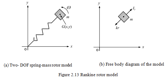 where Fc is the centrifugal force (= mω2R), R is the radius of path of the mass, and r is the extension of the spring of stiffness, k. It can be physically also visualized as there will not be any resonance condition, as it is found in the single DOF model, when the spin speed is increased gradually. This is a serious limitation of the Rankine model. Moreover, this model does not represent the realistic rotating unbalance force.