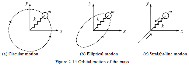 The single DOF rotor model has limitations that it cannot represent the orbital motion of the rotor in two transverse directions, which is the case in actual practice. Rankine (1869) used a two-DOF model to describe the motion of the rotor in two transverse directions as shown in Figure 2.13(a). The shape of orbit produced depends upon the relative amplitude and phase of the motions in two transverse directions (which in turn depend upon relative difference in stiffness in two transverse directions). The orbit could be a circular, elliptical or straight line, inclined to the x and y axes, as shown in Figure 2.14. The straight-line motion (Fig. 2.14c) could be considered as a single-DOF system described in Section 2.1, whereas, the elliptical orbital motion (Fig. 2.14b) may occur when the shaft has different stiffness in two orthogonal directions (along with cross-coupled stiffness terms).
