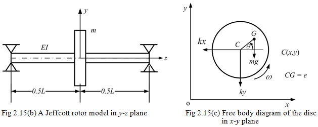 where E is the Young’s modulus, I is the second moment of area of the shaft cross-section, and L is the span of the shaft. and are coordinates to define the position of the centre of rotation of the rotor, C (Fig. 2.15c). Here o is the static equilibrium of the disc (for small deflection it can be approximated as if it is located at bearing axis as shown in Fig. 2.15a). The location of the unbalance is given by θ, which is measured from the x-axis in the counter clockwise direction. Thus, three geometrical coordinates (x, y,θ) are needed to define the position of the Jeffcott rotor (i.e., it has three-DOFs). The disc is at the mid-span, hence, the tilting of the disc about transverse axes (i.e., x and y) are not there.