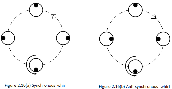 Other kinds of whirl motions, which may occur in real systems, are: anti-synchronous (i.e., v = -ω; as shown in Figure 2.16(b)) and asynchronous (i.e., v ≠ ω). The anti-synchronous whirl may occur when there is rub between the rotor and the stator, however, it occurs very rarely. For this case, the sense of rotation of the shaft spin and the whirling are opposite. Asynchronous whirl motion may occur when speeds are high (e.g., when gyroscopic effects are predominate) or when the rotor is asymmetric or when dynamic properties of the bearing are anisotropic. The asynchronous whirl motion may occur even in the perfectly balanced rotor, and due to this it will have whirl frequency as one of the natural frequency of the rotor system as long as the rotor linear model is considered. The black mark on to the shaft will not be so systematic as in Figure 2.16 and may occupy various positions depending upon the frequency of whirl.