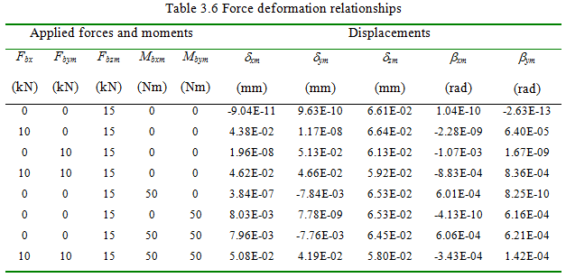Table 3.6 summaries the analysis for various loading conditions. When only an axial load is applied, the axial displacement is found to be significant, other displacements are negligible. Along with the axial, if some radial load is applied, the radial displacement is found to vary significantly and angular displacements are very small. Now if in addition to axial load, some moment is applied, considerable amount of the angular displacement is observed. For combined loading all displacements are found to be significant. These load-deflection relations can be used to obtain the stiffness coefficients, by giving small perturbations to these forces (or moments) and estimating the change in the deflections. Now, the calculation of stiffness for a simple loading of pure radial case is considered, subsequently. However, now we will be adding the effect of centrifugal forces in rolling elements.
