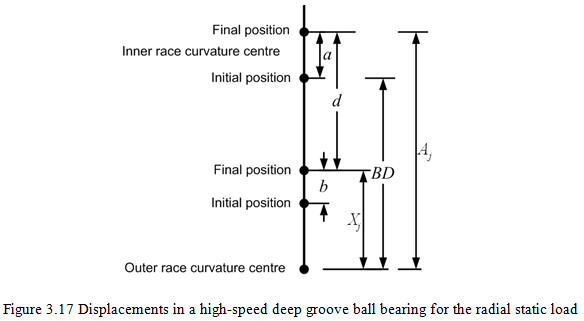 Figure 3.17 shows the displacement of a ball bearing due to a radial loading. Under no load centers of raceway groove curvatures are separated by a distance BDb, i.e. (fo + fi -1)Db, where fo = ro/Db and fi = rii/Db. Distances a is given by δr cosψj, b =δoj and d = (fi - 0.5)Db + δij, where δr is the radial displacement of the bearing, δij and δoj are contact deformations at the inner and outer raceways, respectively, of jth rolling element at azimuth angle of ψj.