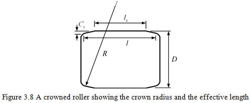 The effective length of rollers is that length of roller which is actually in contact with the raceway, usually this is equal to the actual roller length minus the roller corner radii as shown in Figure 3.8. The relationship between the load-deformation constant, the applied compressive load, and the elastic deformation at a single roller due to inner and outer raceway contacts is given by