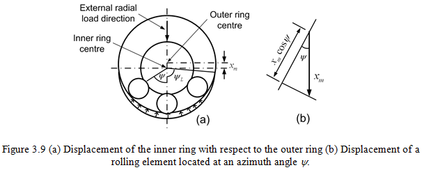 In roller bearings there is a line contact between the rolling element and bearing raceways at no load conditions. Equations (3.5) to (3.10) indicate relationships of elastic deformation at one rolling element under the action of a single compressive force applied at the rolling element (i.e., the ball or roller). In real bearings where more than one rolling element is in compression (i.e., all the rolling elements within the load zone), the effect at each element should be incorporated as shown in Figure 3.9.