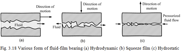 For a normal load to be supported by a bearing, positive-pressure profiles must be developed over the bearing length. Figure 3.18 illustrates three ways of developing positive pressure in fluid-lubricated bearings. For a positive pressure to be developed in a hydrodynamic bearing (Fig. 3.18a) the lubricant film thickness must be decreasing in the direction of motion. This action can be realized as motion of an inclined palm (e.g. 300 with direction of motion) over the surface of water. The palm will feel a upload thrust because of this wedge action between the palm and the water. In a squeeze film bearing (Fig. 3.18b) the squeeze action takes place because the bearing surfaces approach each other with the squeeze velocity. The squeeze mechanism of pressure generation provides a valuable cushioning effect when the bearing surfaces come closer to each other. Positive pressures develop only when the film thickness diminishes. This cushioning (squeeze) action can be felt when the palm is immerged in a bucket of water and then try to approach the wall (or bottom) of the bucket with certain velocity. In externally pressurized bearing, sometimes referred to as “a hydrostatic bearing” (Fig. 3.18c), the pressure drop across the bearing, supports the load. The load carrying capacity is independent of bearing motion and lubricant viscosity. There is no wear due to surface contact at the starting and the stopping of a rotor as there is with the slider bearing. This action can be felt if a thumb is pressed against the hole of a tap and then gradually the tap is opened. Because of the static pressure of the water the thumb will be lifted up (pushed away) from the hole of the tap.