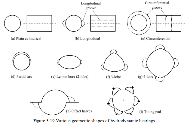 The most journal bearings operate at steady state eccentricity ratios (journal eccentricity/radial clearance) of about 0.6 – 0.7 so as to ensure that the bearing is not prone to self-excited vibrations. Hydrodynamic journal bearing can have a significant role on dynamics of rotors. The fluid film is equivalent to a complicated arrangement of the direct and cross coupled springs and dampers, and so influences the machine critical speeds and unbalance response. Moreover, bearing fluid film forces can cause rotor instability, which results in serious levels of self-excited vibration (e.g., fluid-film whirl/whip). The most common forms of the bore (solid line) and lubricant inlet ports (dotted line) of journal bearings are provided in Figure 3.19 and compared in Table 3.7.