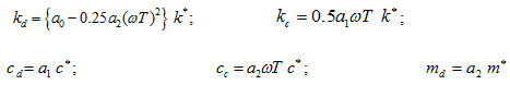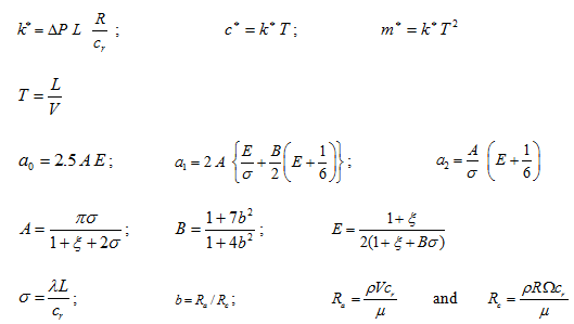 where k, m, and c are the stiffness, mass and damping coefficients respectively, k*, c* and m* are reference values of corresponding quantities, a0, a1 and a2 are dimensionless coefficients, ω is the speed of the rotor, T is the transit time as given in equation (3.119), L is the length of the seal, V is the average axial stream velocity, ξ is the entrance loss coefficient, ρ is the fluid density, λ is the friction coefficient, R is the radius of the seal, cr is the clearance of the seal, and ΔP is the difference between pressures at the inlet and the exit of the seal. Subscripts d and c represent the direct and cross-coupled terms, respectively. Ra is the Reynolds number for the axial flow, and Rc is the Reynolds number for the circumferential flow for smooth annulus seals. Dimensional coefficients are thus functions of ξ, σ, and b. To determine coefficients a0, a1 and a2 another coefficients σ and b are required for the frequently occurring value of ξ = 0.5. From Childs (1983a), we have