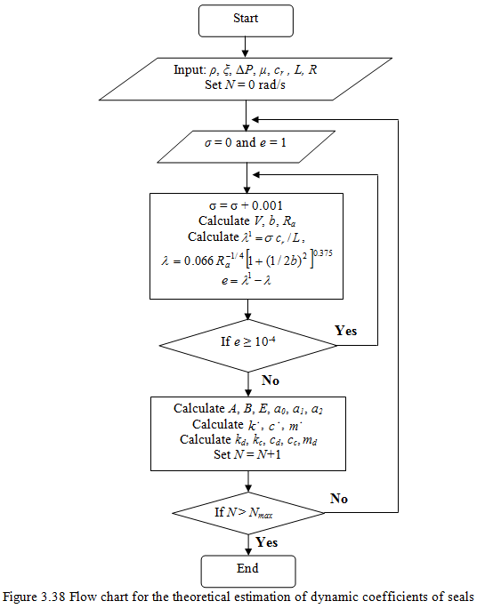 Since the desired value of λ is also function of V and thereby σ, hence, it is best obtained iteratively. From σ the dynamic coefficients can be obtained for different speed ω. Figure 3.38 shows an algorithm for the solution of dynamic coefficients of seals using equations (3.117) to (3.125).