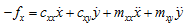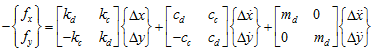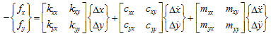 where fx and fy are fluid-film reaction forces on seals in x and y directions. k, c, m represent the stiffness, damping and added-mass coefficients, subscripts: xx and, yy represent the direct, and xy and yx represent the cross-coupled terms, respectively. These coefficients vary depending on the equilibrium position of the rotor (i.e., the magnitude of the eccentricity), rotational speed, pressure drop, temperature conditions, etc. The off-diagonal coefficients in equation (3.126) arise due to fluid rotation within the seal and unstable vibrations may appear due to these coefficients. Equation (3.126) is applicable to liquid annular seals. But for the gas annular seals, the added-mass terms are negligible. For small motion about a centered position (or with very small eccentricity) the cross-coupled terms are equal and opposite (e.g., kxy = -kyx = kc and cxy = -cyx = cc) and the diagonal terms are same (e.g., kxx = kyy = kd and cxx = cyy = cd) (Childs et al., 1986). Considering these relationships and neglecting the cross-coupled added-mass terms, equation (3.126) takes the following form