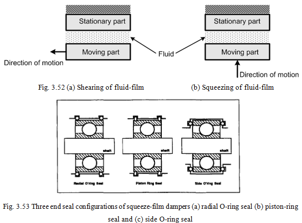 Squeeze-film dampers can be regarded as a fluid-film cylindrical bearing without the rotation of the journal. The fluid film gets the shearing action due to the relative translatory motion of the bearing (Fig. 3.52(a)) rather than the squeezing action due to the relative transverse motion of the damper (Fig. 3.52(b)). Squeeze-film dampers usage in attenuating vibrations is widespread in aircraft gas turbine industries as compared to the process industries where its preferred usage is as a band-aid solution without any preplanning. This is due to the reason that squeeze-film dampers are more complex to design than any other machine elements. The attenuation of subharmonic rotor instabilities would be the main concern in the designer mind while designing a squeeze-film damper since steady state synchronous vibrations are relatively easier to tackle with modifications in the rotor and the bearing parameters itself (Zeidan, et al., 1996).