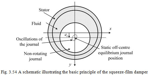 Similar to fluid film bearings, for squeeze-film dampers the fluid-film forces generated by small amplitude of oscillations about a static equilibrium (off-centre) position are useful for the stability analysis of rotating machinery. A schematic of squeeze-film geometry and the motion of journal performing small oscillations at an off-centered static equilibrium position are shown in Fig. 3.54, where es is the static eccentricity.