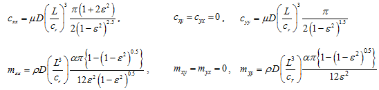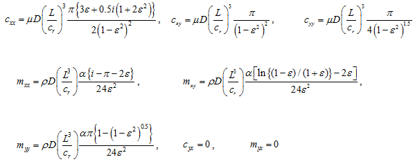 ); L, D, and cr represent the damper axial length, diameter, and radial clearance, respectively; ρ and µ are the fluid density and viscosity, respectively; and e is the eccentricity ratio. Expressions are valid for the isoviscous and incompressible fluids undergoing isothermal process within the damper. For short length open ends squeeze-film damper, the rotordynamic coefficients are given as (with cavitations, i.e. the half-film model)