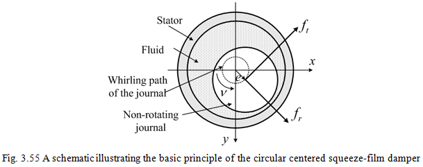 For circular centered journal (i.e., the outer ring in rolling bearings or the bush in fluid-film bearings) motions (Fig. 3.55) of the amplitude, e, and whirl frequency, ν, in a perfectly cylindrical bearing, a damper produces a constant fluid force in a reference frame rotating with angular frequency of, ν. The radial and tangential components of the fluid force are equal to