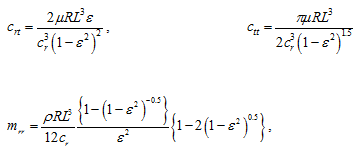 where Vt and ar are the tangential velocity and the radial acceleration, respectively, of the journal centre; (crt, ctt) and (mrr, mtr) are the cross-coupled and direct damping and inertia force coefficients, respectively. It should be noted that these linearised coefficients are defined for small motions only. For the short-length approximation, -film assumption (i.e., half the circumferential film extend is cavitated) and open ends squeeze-film damper model, the force coefficients are given as (Vance, 1988)