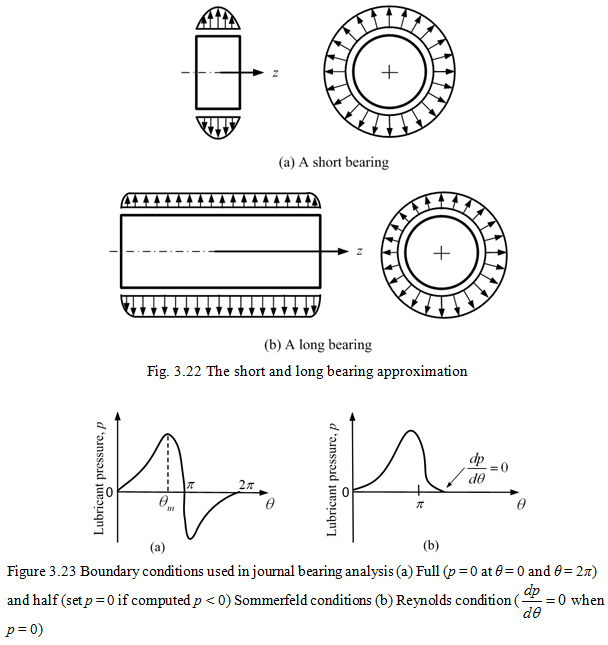 Equation (3.79) describes the variation of lubricant pressure in both the axial (i.e., z) and circumferential (i.e., s) directions. An approximate solution (closed form) may be obtained by using the short bearing (Ocvirk, 1952) approximation. In this case the pressure variation in the circumferential direction (i.e., ∂p/∂s) is assumed to be negligible compared with that in the axial direction (i.e., ∂p/∂z) and so that ∂p/∂s is set to zero (Fig. 3.22a). This approximation also enables closed-form solution of equation (3.79) to be obtained, provided that appropriate boundary conditions (Figure 3.23) are selected to enable evolution of the constants of integration (Cameron, 1981; Pinkus and Sternlicht, 1961 and Rao, 1993).