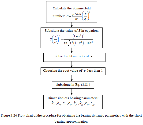 Variations of the dimensionless stiffness and damping coefficients with Sommerfeld number for the case of short bearing approximation is shown in Figure 3.24 (a) and (b). Variation of the eccentricity ratio with the Sommerfeld number is given in Figure 3.25. Algorithm for finding dimensionless bearing dynamic parameters from the Sommerfeld number is given in Figure 3.26.