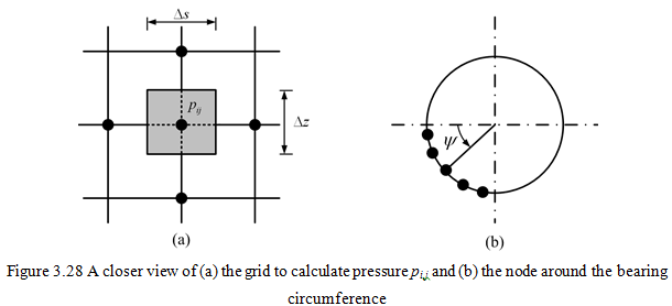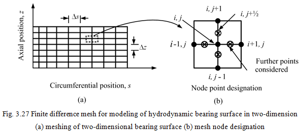 In practice real hydrodynamic bearings cannot be accurately modeled as either the case of infinitely long bearing or the case of infinitely short bearing. Most bearings have a length-to-diameter ratio in the range 0.5 to 1.5. Hence, the approximate solutions of the short or long bearing may be used in preliminary design calculations only. However, final design studies will often require a more realistic analysis by at least using two-dimensional Reynolds equation. For a more general solution of the Reynolds equation, which is a partial differential equation, it is necessary to use numerical methods. The most common numerical technique used in hydrodynamic journal bearing analysis is the finite difference method, because of its relative ease with which it can be adapted to most bearing geometries. The problem is reduced to a two dimensioned by considering the fluid film to be unwrapped from around the journal (Fig. 3.20c). The unwrapped fluid film is then divided into a number of sections of finite size by describing it in terms of mesh nodes, as shown in Figure 3.27a. Here s is the circumferential position and z is the axial position. In between each nodes described, a number of further points are considered, for example those surrounding the node (i, j) are shown in Figure 3.27b. Since the Reynolds equation describes the behavior of the lubricant at any location in the fluid film, it can be written for every specific node contained within the finite-difference mesh.