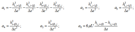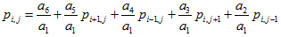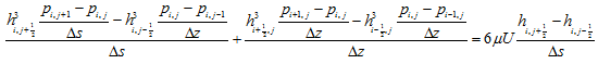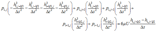 where hi,j+1/2 is the film thickness between (i, j) and (i, j + 1) nodes; and a1, a2 etc. are constants whose values are known for every nodes. Equation may then be written for every node in the mesh, except for those where the lubricant pressure is already known (for example at the nodes representing the ends of the bearing where the lubricant pressure must be equal to the ambient pressure). These equations can then be solved simultaneously to get lubrication pressure at all nodes.