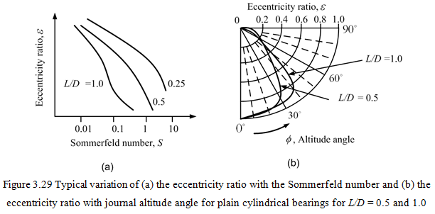 For bearing designed to carry vertical loads only (for example the gravity load) the relationship between eccentricity ratio ε and journal attitude angle, Φ, may be determined by investigating different values of Φ for a given value of ε until the value of Fh is found to be zero. For example, once we choose an arbitrary value of ε, Φ then corresponding film thickness can be obtained (since ε, Φ determines the position od the shaft with respect to the bearing bore). Using iterative procedure (or using all simultaneous solution procedure) the pressure distribution is obtained by putting negative pressure equal to zero, wherever it occurs. Resultant forces of the journal is obtained by using equations (3.88) and (3.89), for Fh = 0 and Fv = W . If the above force conditions are not satisfied, then different value of Φ could be chosen until the force conditions are satisfied up to the desired accuracy. When this process is completed it is found that, because the Reynolds equation is a continuous function, the final pressure distribution corresponds to the Reynolds boundary conditions with the constraint of ∂p/∂θ = 0 at the trailing edge of the lubricant film automatically catered for. Above procedure can be repeated for different value of ε to get relationship between of ε-Φ for a particular bearing at different operating conditions. This trial and error method enables corresponding value of ε, Φ , and Sommerfeld number S to be found. A typical steady-state journal loci for plain cylindrical bearings and their relationship with the Sommerfeld number are shown in Figure 3.29. For details readers are referred to book by Hamrock (1994).