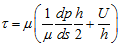where r is in film thickness direction, μ is fluid dynamics viscosity, and du/dr is velocity gradient across the fluid-film. In a hydrodynamic the velocity gradient term arises partly from the variation in pressure around the journal causing lubricant flow and partly as result of the journal rotation dragging lubricant around the clearance space. Thus, for a point at the journal surface, equation (3.90) becomes