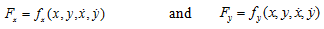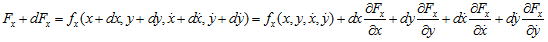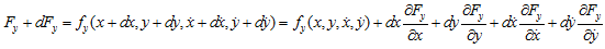 where are both zero. When there are changes in these displacements and velocities, the new values of lubricant film forces will be Fx + dFx and Fy +dFy, respectively. These forces may also be expressed using equation (3.96) as a four-variable Taylor series, neglecting higher order small terms, as